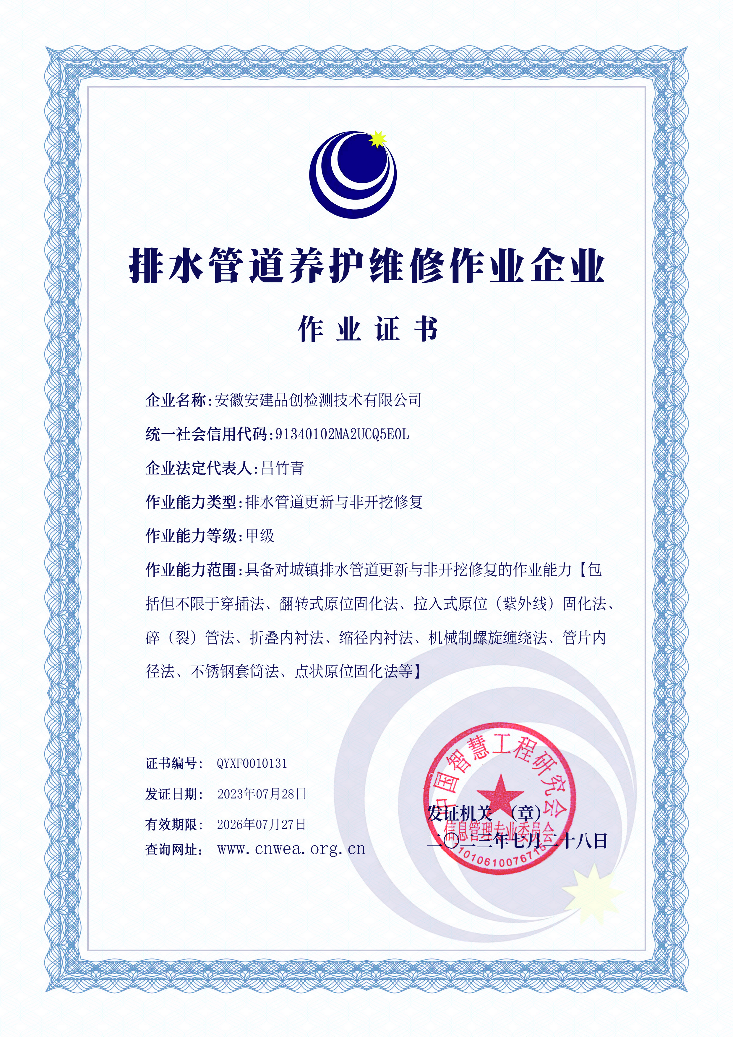 近日,安徽安建品創檢測技術有限公司正式獲得行業協會批準,取得城鎮排水管道更新與非開挖修復作業能力甲級證書。