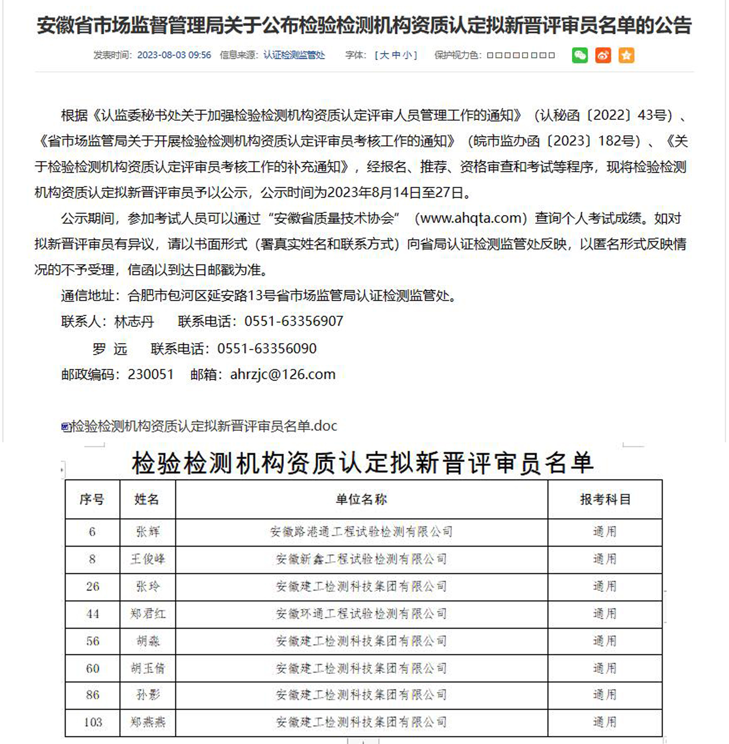 近日,從安徽省市場監督管理局傳來喜訊,建工檢測(含子公司)新晉8名檢驗檢測機構資質認定通用類評審員,本次全省僅新晉通用類評審員103人!