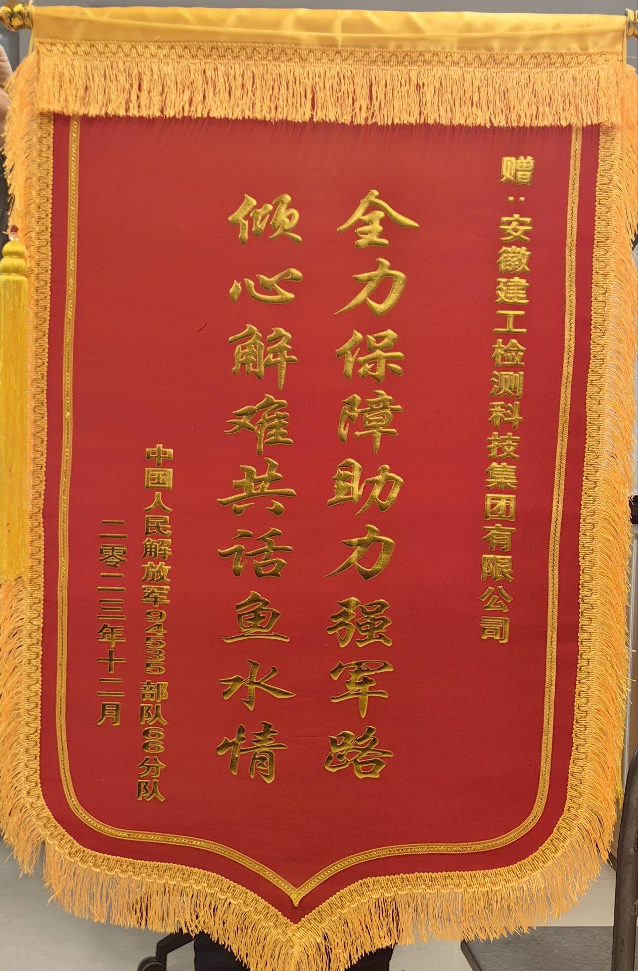 12月10日,中國人民解放軍 94535部隊66分隊將一面印有“全力保障助力強軍路,傾心解難共話魚水情”的錦旗送到了安徽建工檢測,以此感謝建工檢測承接的新站高新區駐區部隊營區內部道路工程檢測項目的高效完工。
