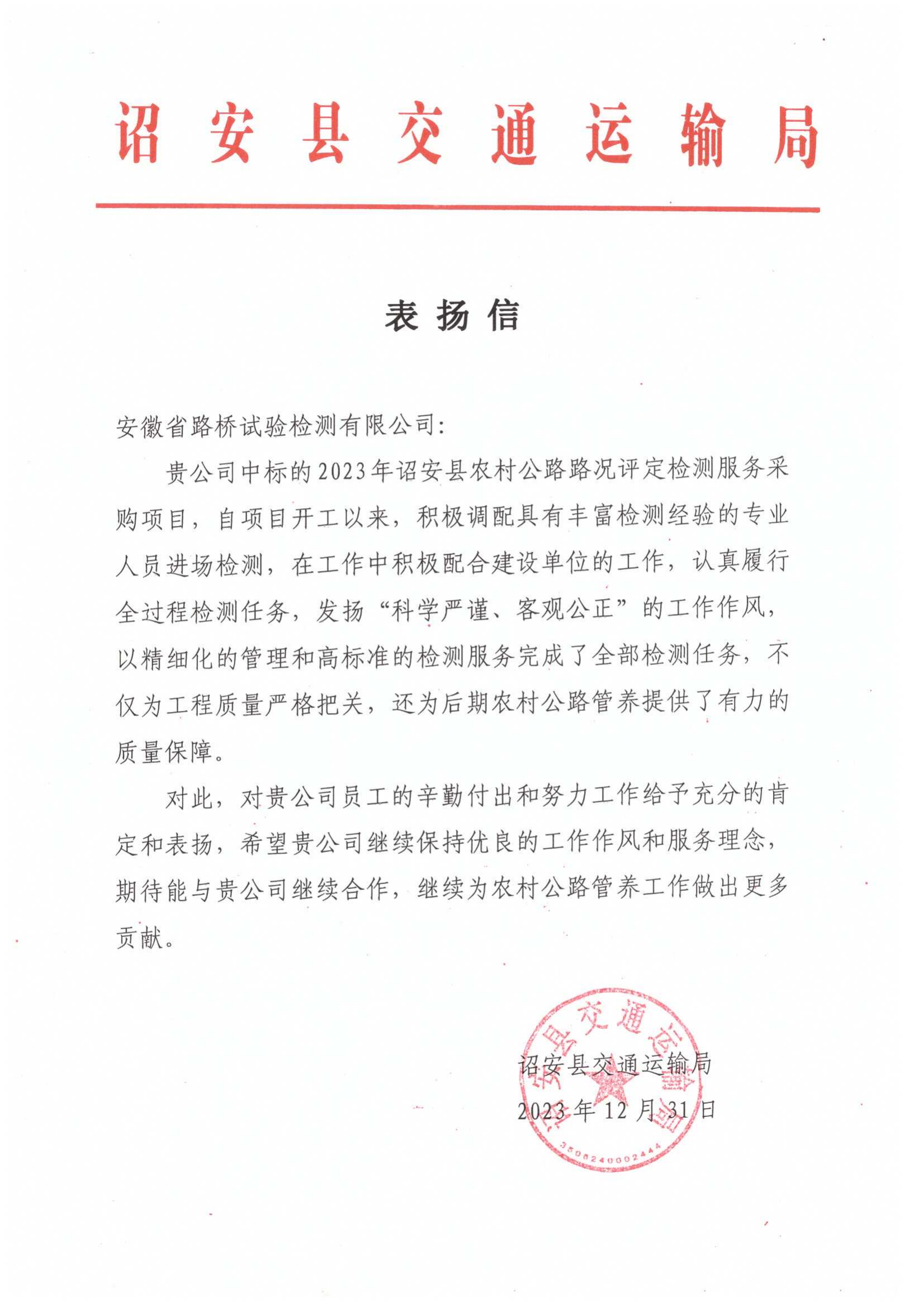 近日,福建省漳州市詔安縣交通運輸局向安徽省路橋試驗檢測有限公司發來了一封表揚信。對路橋檢測公司在保障道路交通管養、提供優質技術支持等方面的工作給予高度評價。