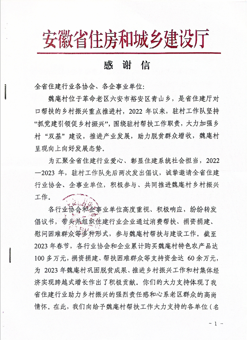 省住房和城鄉建設廳致信感謝我司助力脫貧攻堅工作