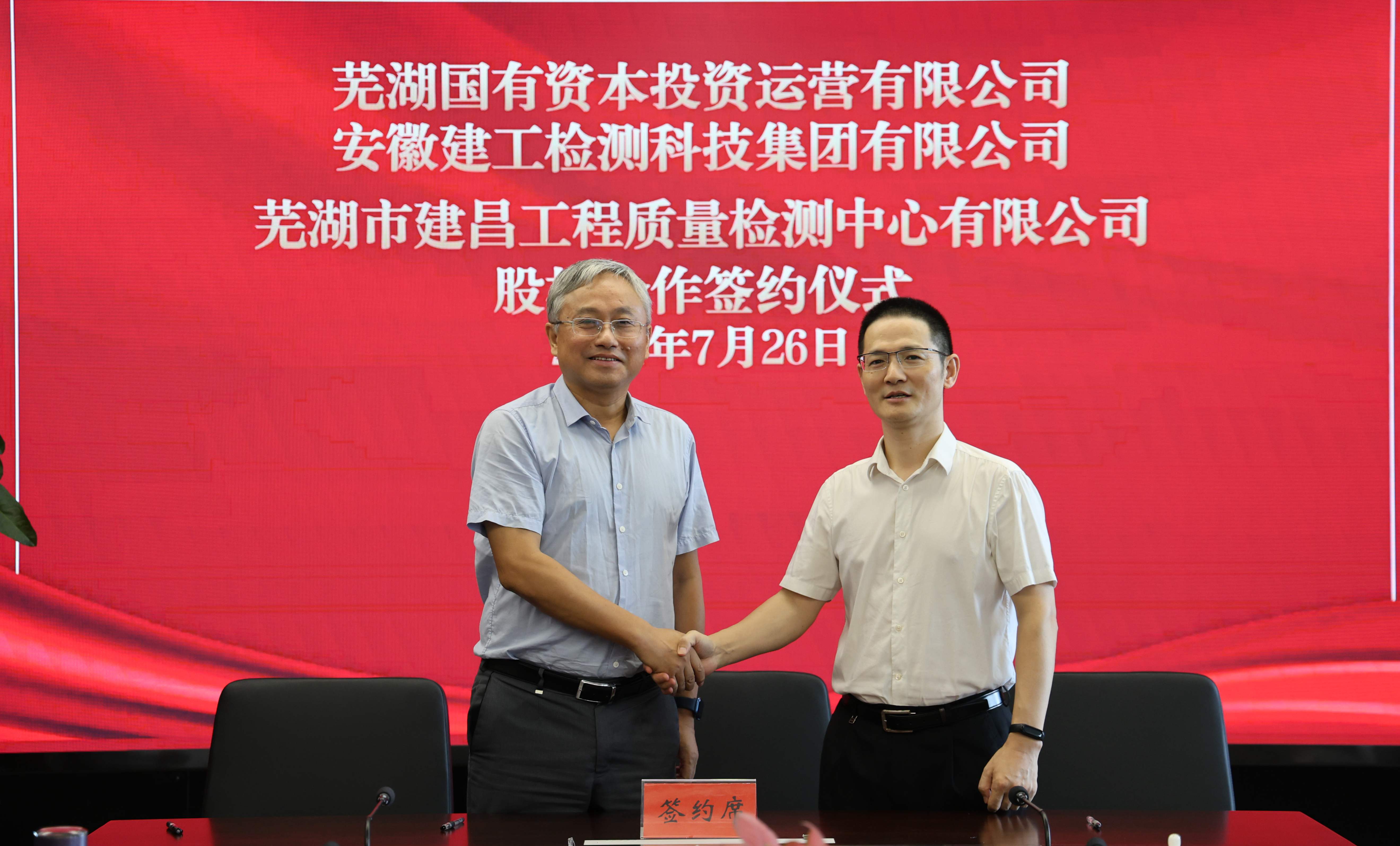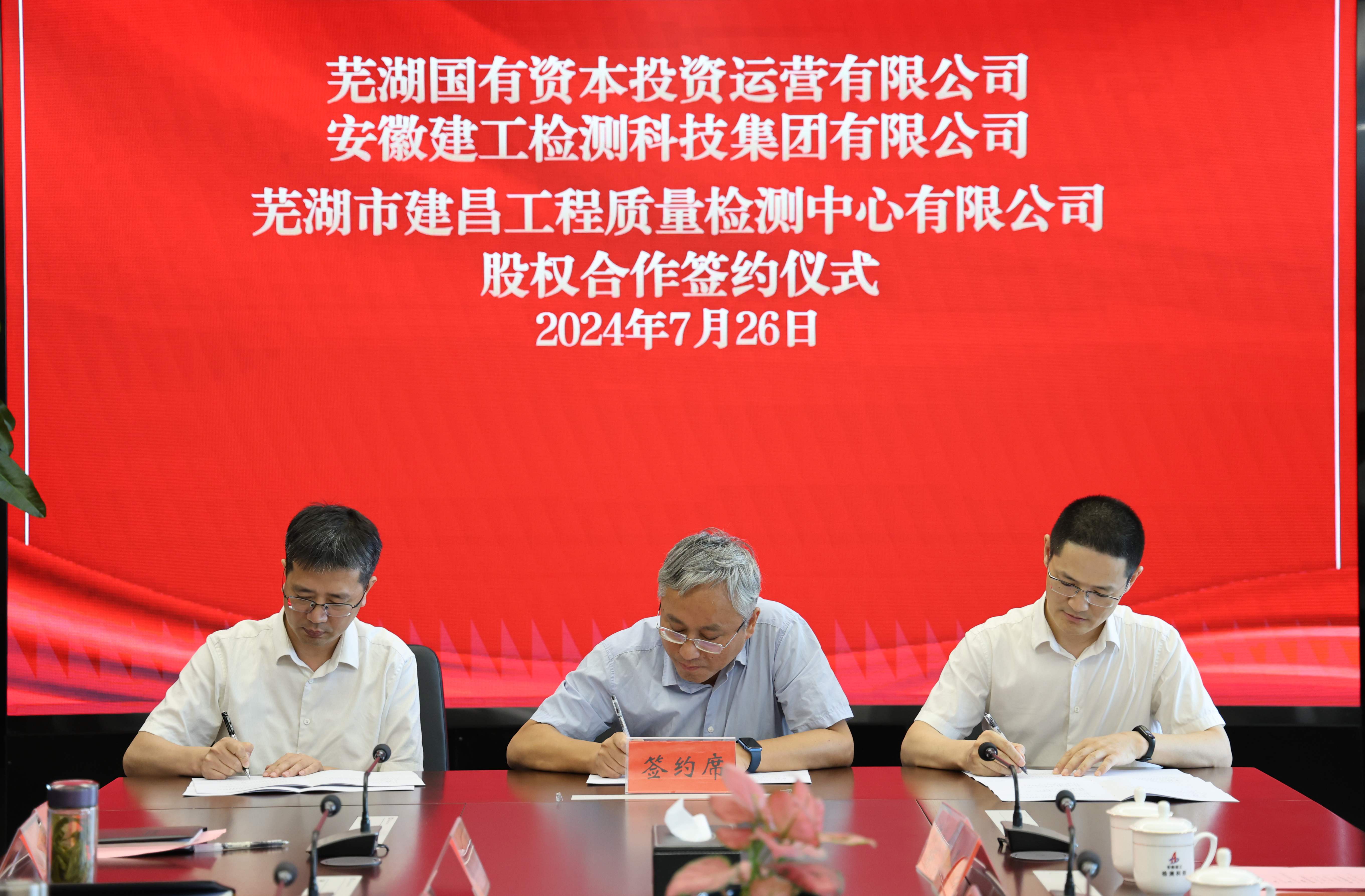 7月26日上午,安徽建工檢測科技集團有限公司(以下簡稱“建工檢測”)與蕪湖國有資本投資運營有限公司(以下簡稱“蕪湖國投”)及蕪湖建昌工程質量檢測中心有限公司(以下簡稱“蕪湖建昌”)在建工檢測共同簽署了股權合作協議。