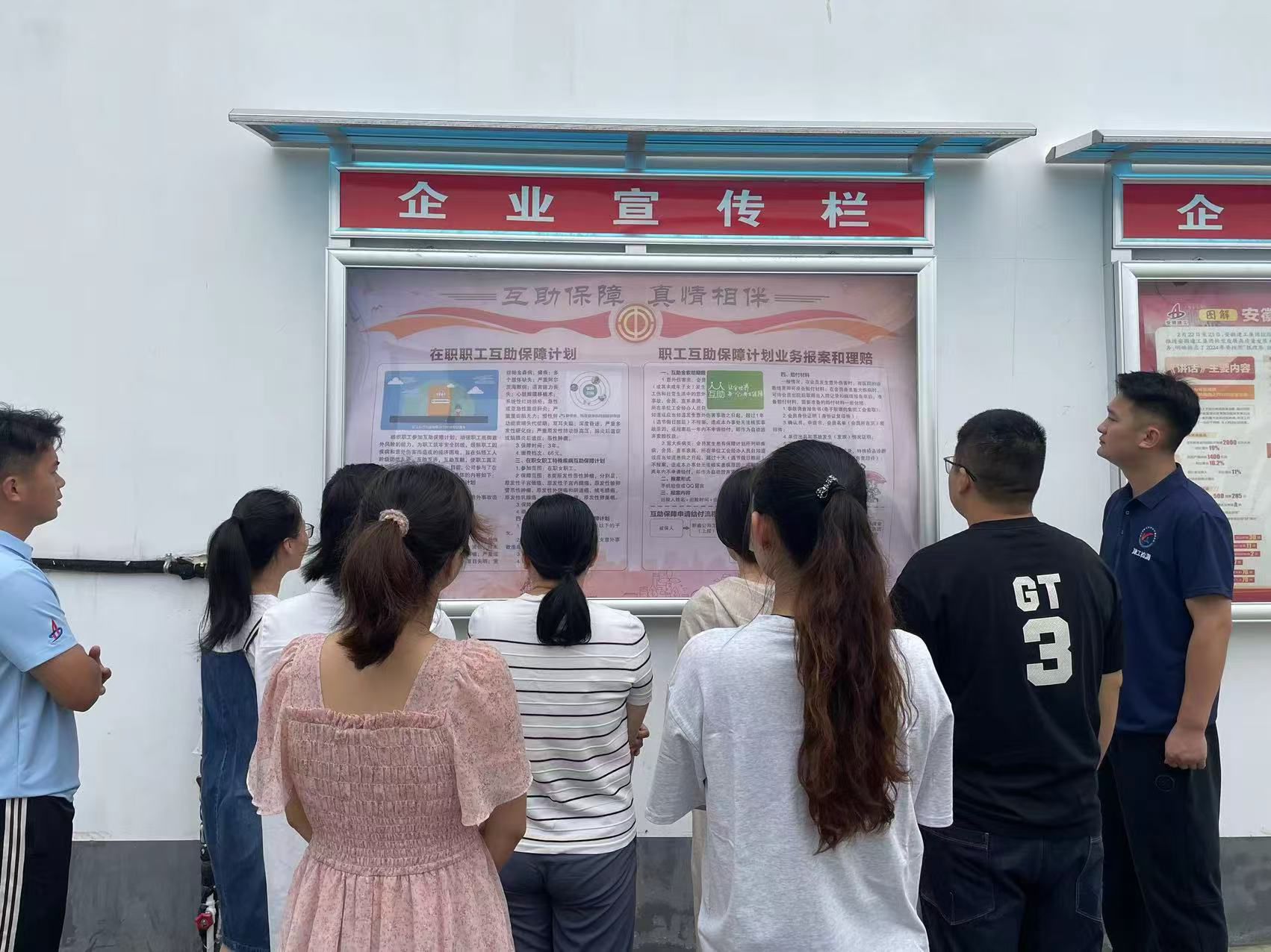 工作人員在宣傳櫥窗前耐心細致地向職工講解互助保障的相關政策,包括具體流程、投保性質、投保對象、投保經費、保障范圍、保險期限等內容,并對職工提出的問題進行現場答疑。此外,新鑫檢測還積極利用周例會、微信群、QQ群等載體對互助保障內容進行宣傳,通過拓寬宣傳渠道,切實提高廣大職工對互助保障的認識了解。