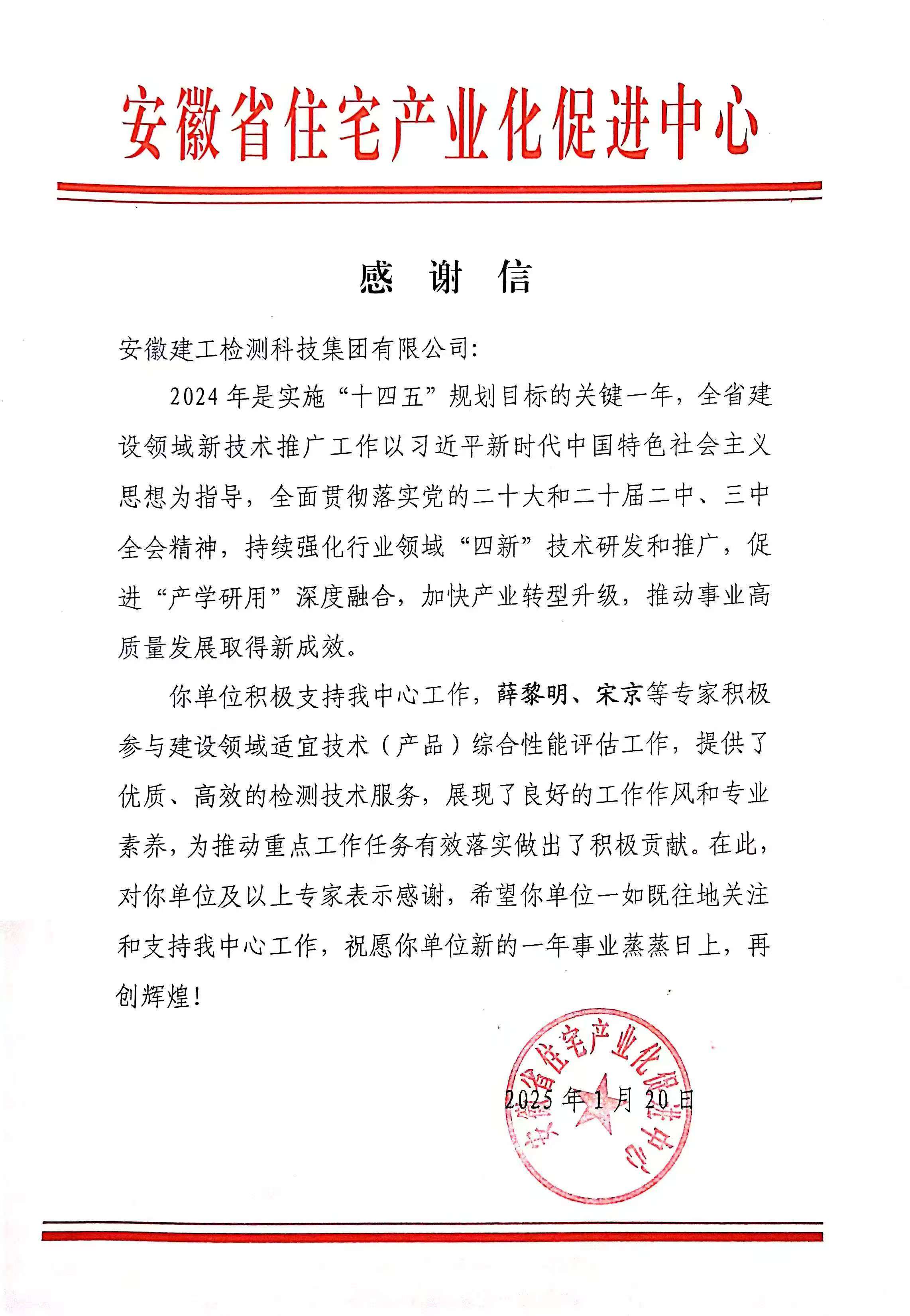 近日,建工檢測收到了安徽省住宅產業化促進中心發來的感謝信。信中對建工檢測及所屬職工薛黎明、宋京等積極支持并參與建設領域適宜技術(產品)綜合性能評估工作,為推動重點工作任務有效落實做出的積極貢獻,給予了充分肯定和衷心感謝。
