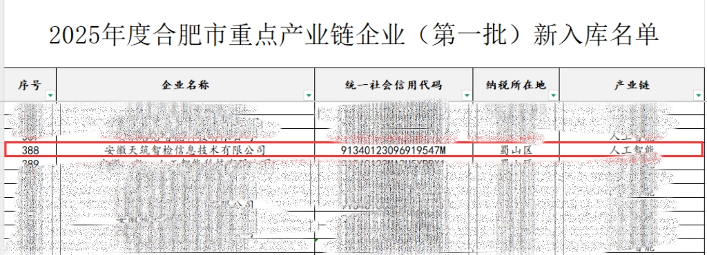 喜報!天筑智檢公司成功入庫2025年度合肥市重點產業鏈企業