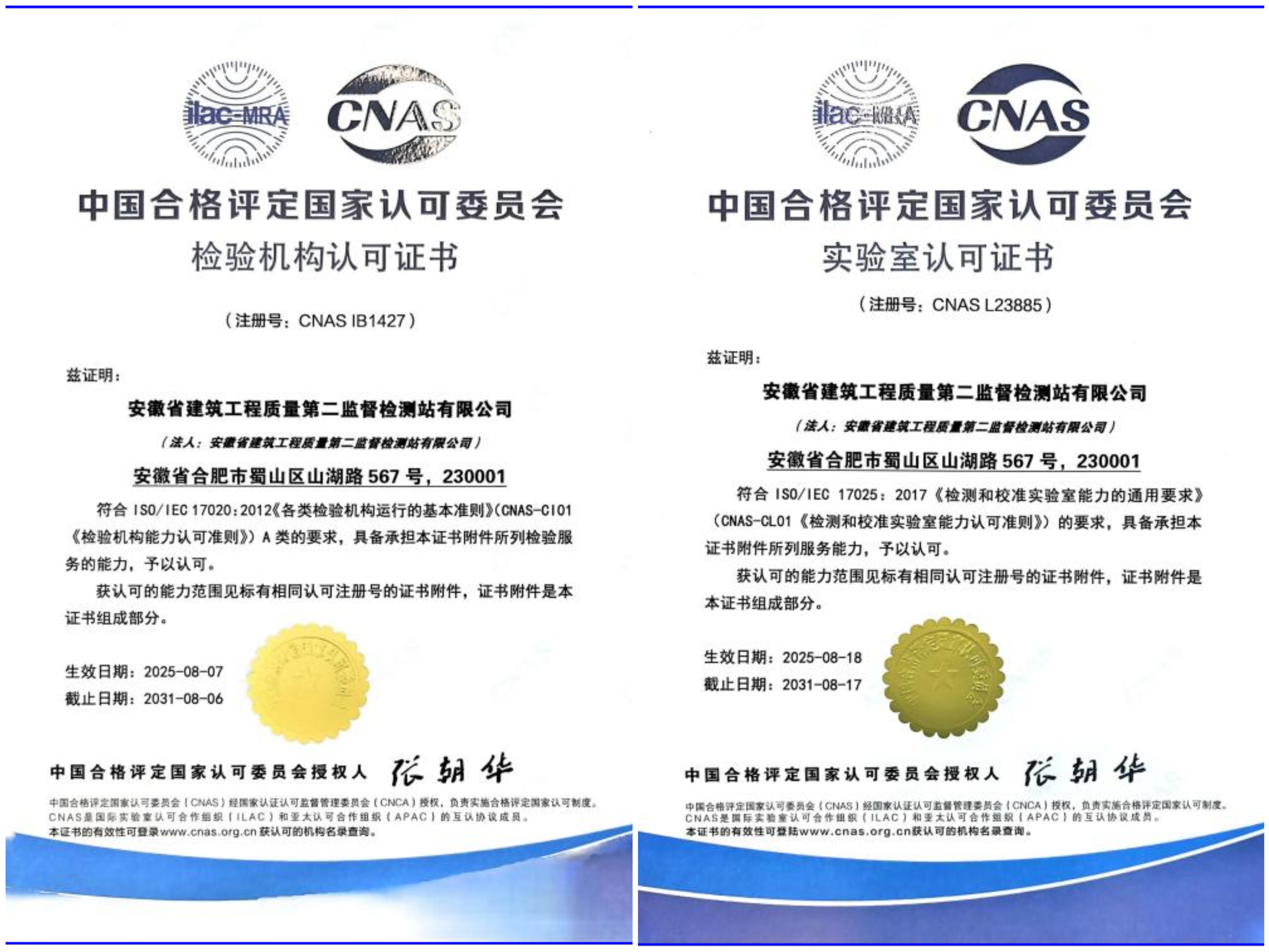 近日,安徽省建筑工程質量第二監督檢測站有限公司(以下簡稱“二站”)順利通過中國合格評定國家認可委員會(CNAS)評定,成功獲得檢驗機構認可證書和實驗室認可證書。