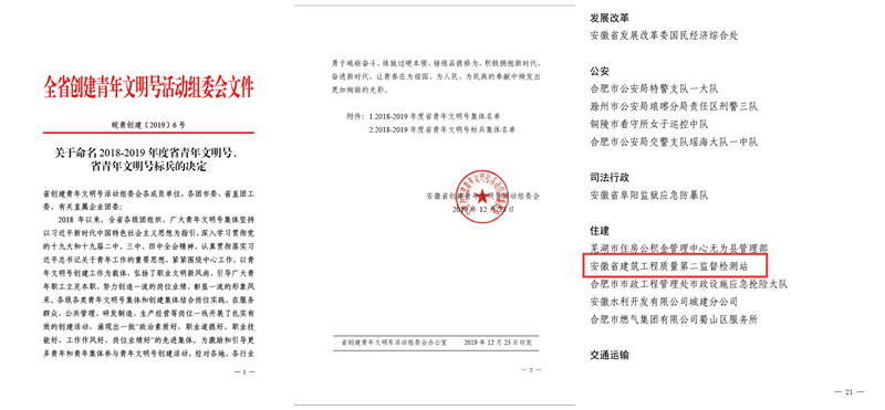 近日,從安徽省住建廳創建青年文明號活動組委會傳來喜訊,安徽建科質檢二站被命名為2018-2019年度 “青年文明號標兵”榮譽稱號,在二站榮譽墻上再添一抹青春色彩。
