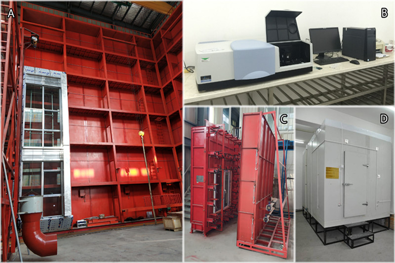 圖 2 門窗幕墻所部分檢測用儀器設備:(A) 幕墻物理性能檢測設備;(B) PerkinElmer 分光光度計;(C) 扣箱式門窗物理性能檢測設備;(D) 建筑門窗保溫性能試驗機