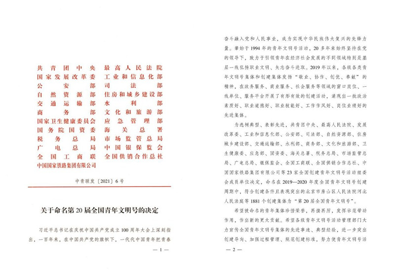 此次命名表彰由共青團中央、最高人民法院、發展改革委、工業和信息化部、公安部等23家全國創建青年文明號活動組委會成員單位開展,經綜合考察、逐級推報、集中審核、社會公示等程序評選產生。