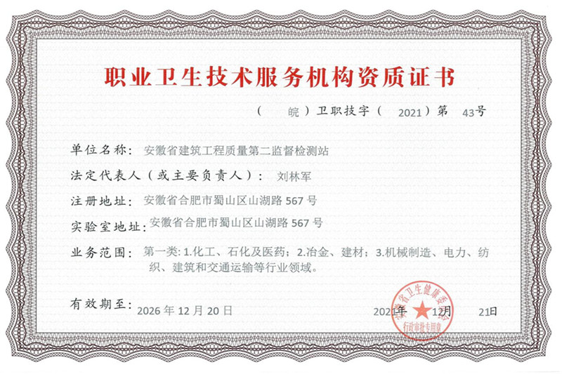 近日,經安徽省衛健委認定,二站順利取得職業衛生技術服務機構資質證書。