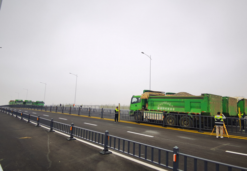 在前期精心制定試驗方案的基礎上,二站現場投入20余名技術人員,劃分為設備組、聯絡組、測量組等6個小組,各司其職,有序高效。在現場技術人員的指揮下,荷載試驗按方案依次開展。靜載試驗時采用9輛三軸載重汽車按不同工況、不同位置分級對各控制截面進行等效加載,變化著花樣“考驗”大橋,檢驗結構的強度、剛度和抗裂性等工作性能,通過環境隨機激振法、行車激振法和跳車激振法測試橋跨結構的動力特性。現場配備精度高、抗干擾能力強的無線動、靜態采集分析系統及高精密電子水準儀對應力(應變)、位移、自振頻率等參數進行實時采集分析。在整個試驗過程中,大橋各測試參數正常,整體表現優良,順利通過各項“考驗”。