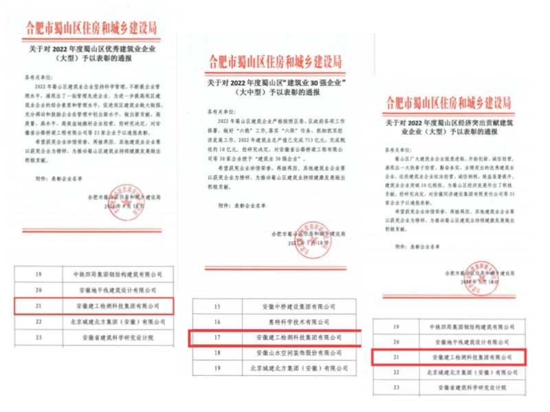 2023年5月18日,合肥市蜀山區住房和城鄉建設局發布對區內建筑業企業予以表彰的通報,我司榮獲“優秀建筑業企業”、“建筑業30強企業”、“經濟突出貢獻建筑業企業”3類獎項。